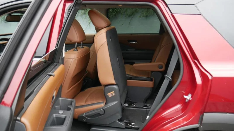 The 2024 Pathfinder is basically the same size on the outside as the Palisade, Telluride, Subaru Ascent, etc. Differences inside are more noticeable, however, particularly in the third row where the seat is a little closer to the floor than you’d find in those mentioned above and therefore less spacious and comfortable. Nissan’s means of getting back there is better than most, however, as the second-row not only slides forward at the touch of a button (that’s quite common), but does so in a way that provides more space to squeeze back into the third-row and allows you to keep forward-facing child seats installed. That could easily be deal-sealer for some.
