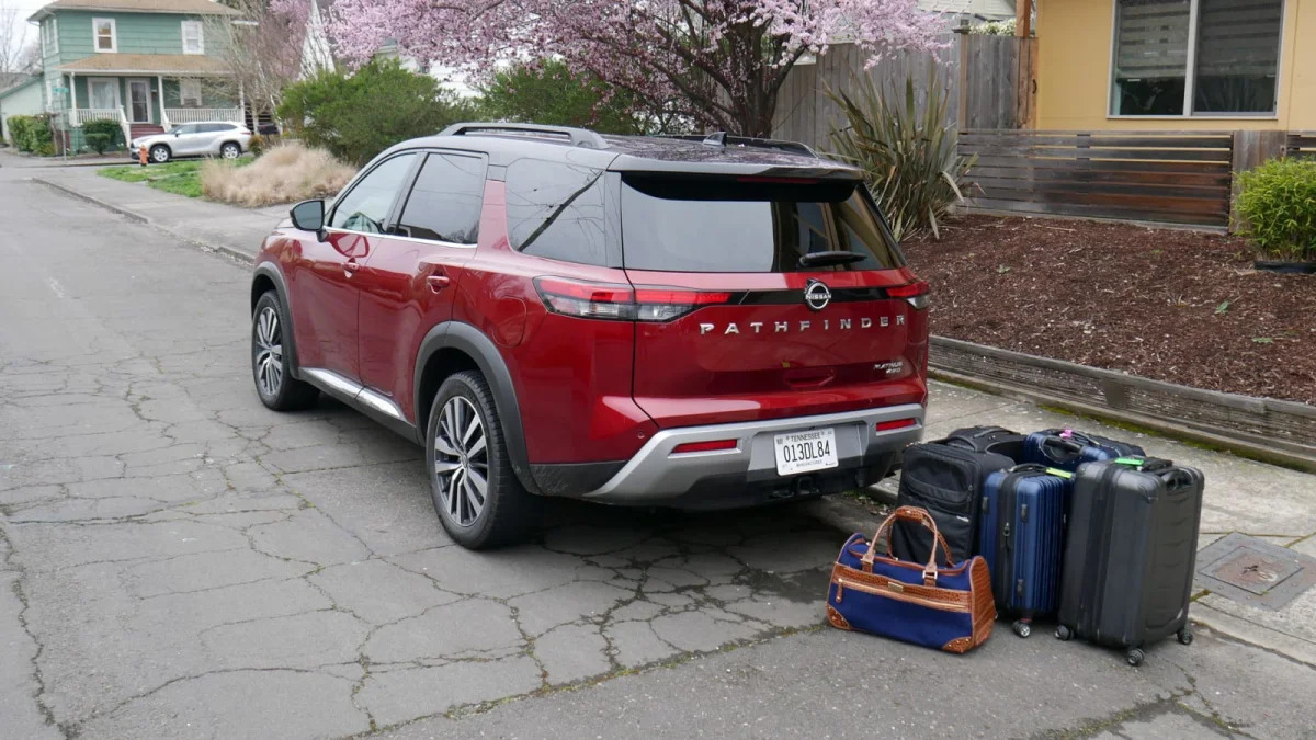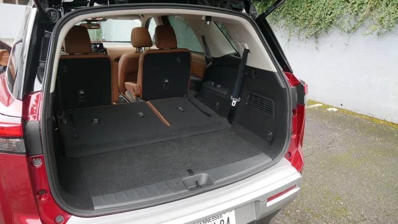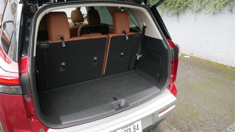 Cargo space behind the raised third row measures at 16.6 cubic-feet. On paper, that would make it barely better than the disappointing Toyota Highlander, but in practice, the Pathfinder’s boxy shape and useful under-floor storage actually help it carry more stuff than its specs would indicate. We could fit four medium-sized suitcases back there plus a duffle bag under the floor, but that still puts in mid-pack for the segment. You can see all of our real-world cargo tests for the segment here. Otherwise, the Pathfinder’s cargo area measures 45 cubic-feet with the third row lowered and 80.5 with both rear rows lowered, which are big enough that differences with competitors shouldn’t matter much.