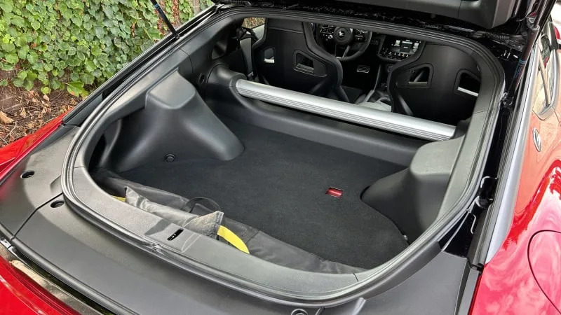 As for cargo space, Nissan hasn’t given official numbers, but Car and Driver reports it has 7 cubic feet. That’s smaller than the Supra’s 10.2 cubic feet. The Z’s cargo area is also oddly shaped, as it’s shallow and wide. There’s also an awful lot of car to clear when lifting things up and into the trunk.
