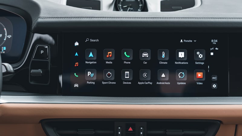 To the right of it sits the latest Porsche Communication Management (PCM) infotainment system, already found in the Taycan, 911 and Panamera. The system is more colorful than the Cayenne’s previous PCM, with icons easier to differentiate at a glance, but it’s mostly similar in overall UI concept. That includes the column of menu icons permanently docked on the left side of the standard 12.3-inch touchscreen, including one to quickly engage and exit Apple CarPlay.