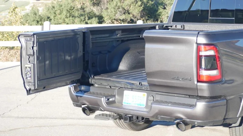 The Ram 1500 has fewer powertrain options than its GM and Ford competitors. The standard engine is a 3.6-liter V6 that is aided by a 48-volt mild hybrid system Ram calls eTorque. It adds a small amount of electricity while accelerating from a stop to increase power and refinement, as well as improving the automatic stop/start system and fuel economy. We explain it more in our Ram 1500 eTorque first drive. Output is 305 horsepower and 269 pound-feet of torque, and an eight-speed automatic is standard. EPA-estimated fuel economy is stated at 20 miles per gallon city, 25 mpg highway and 22 mpg combined with RWD (which is better than Chevy’s base turbo-four engine), and 19/24/21 with 4WD. It wasn’t so long ago that V6-powered midsize sedans were getting that sort of fuel economy.