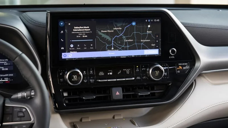 Standard on most trim levels is an 8-inch touchscreen interface, which is mounted high within easy reach and sight. The available 12.3-inch unit is largely similar in terms of its basic operation, but gains functionality by adopting a widescreen orientation. The operating system is the newest that Toyota has to offer, featuring bright, minimalist graphics and natural speech recognition. It’s responsive and runs quickly. The shortcut icons on the side closest to the driver are easy to reach, but they unfortunately disappear when you use Apple CarPlay or Android Auto, meaning you have to click-click-click to escape the Apple/Android interfaces rather than using a simple Home button like Toyota used to feature. There are other annoyances we discovered, particularly with the radio operation and navigation system, which make this system less appealing than those of rivals.