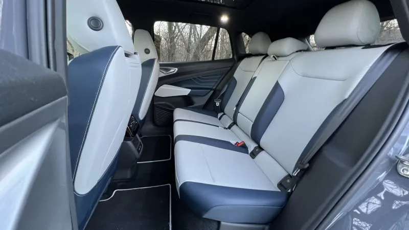The ID.4’s cabin feels spacious and airy, especially with the glass roof, while some of the materials, like the nicely colored leatherettes, help maintain that fresh feeling. It’s an inviting space that feels sleek, modern and unencumbered. Some underlying plastic pieces are on the cheap side, especially in comparison to rival EVs, but they’re not too distracting. Our biggest gripe is with some of the controls, particularly the lack of physical buttons and knobs. The touch-sensitive climate, volume and menu controls are difficult to use, and there aren’t dedicated buttons for the rear windows up front (you have to tap another control to switch the two available toggles between front and rear windows).
