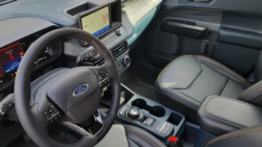 The silver truck appears to be a well-optioned street model (a Lariat, most likely) with a correspondingly robust interior package. You can see it here (below left) next to a 2024 Maverick Tremor (right), which is also based on the Lariat. Quite a bit of the prototype interior is hidden by camo, but we can clearly see that the new screen fills the space where the cubby once was atop the center stack. The wheel and controls appear unchanged.