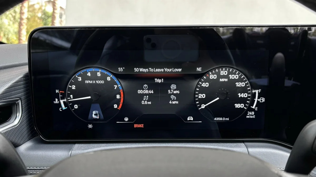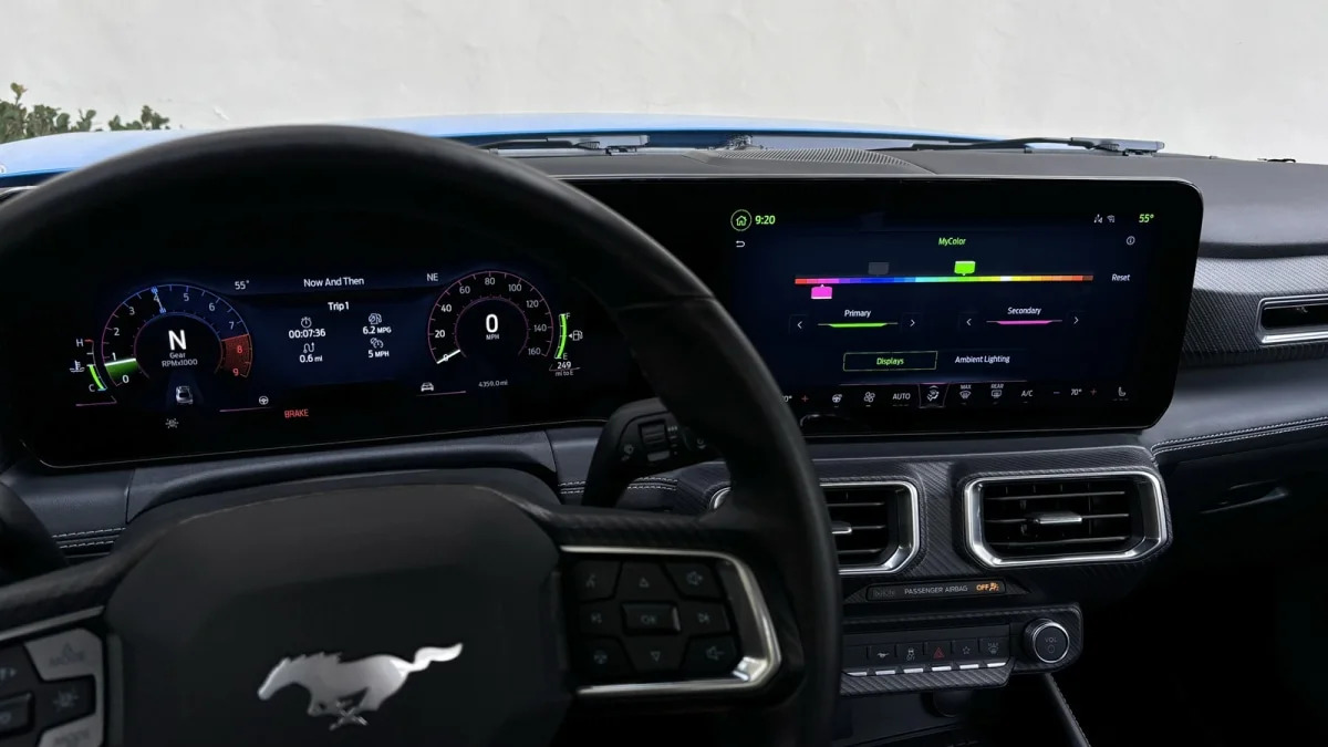 As for the 13.2-inch infotainment touchscreen, it runs off Ford’s existing Sync 4 architecture, but features a different interface with a widescreen orientation. Ford got rid of most physical entertainment and climate controls because replacing them with touchscreen controls was “popular in research with Millenials, Gen-Z and traditional Mustang drivers alike.” Sure it was. Luckily, the climate controls and a bank of menu icons remain docked on the screen, including when using Apple CarPlay or Android Auto. As far as all-screen interiors go, this seems like one of the best. It really does look slick, too. Unfortunately, wireless charging is no longer available for 2025 (good grief, why?), but a USB can still be had behind the rearview mirror for track cameras “and other devices.”