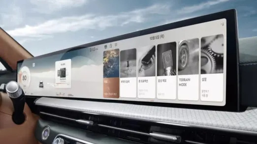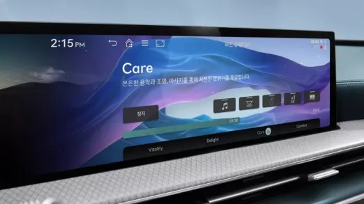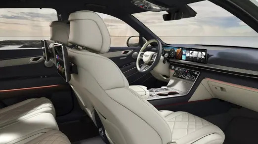 The 2025 GV80 interior is a much bigger deal. The dash has been significantly revamped with a new 27-inch OLED screen encompassing both the instruments and infotainment. It’s silky-smooth and crisp, though the light beige graphics lack contrast and aren’t quite as easy to read at a glance as your typical light text and dials on a dark background. We appreciate that Hyundai has kept the redundant infotainment control setup featuring both touchscreen and rotary controller on the center console. The controller itself is new, however, with a more tactile and responsive knob replacing the original, iPod-like disk. Both it and the shifter dial also benefit from “crystal-like” surrounds that are convincing and add both expensive-feeling heft and a bit of nice flash. The touch buttons and display for the climate controls are a bit silly, but they’re livable, and the knobs for temperature setting are appreciated.