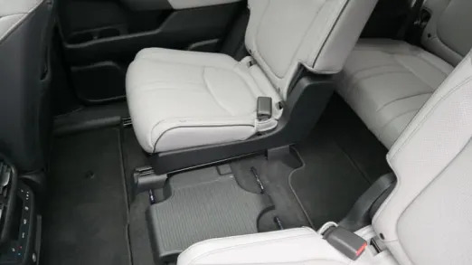 There’s nothing average about the rear seating rows, however. Pictured above, the Pilot’s novel second row is a bench seat, but as in the Honda Odyssey and the Pilot’s Acura MDX cousin, the middle seat folds to create a console-like armrest. It can also be removed completely from the car or, uniquely, stowed in a cubby built into the Pilot’s rear cargo floor. Unlike the Pilot’s competitors, there’s no need to choose between eight-passenger bench seat or seven-passenger captain’s chairs at the dealer. Bear in mind that this feature isn’t offered on the TrailSport. Its full-sized spare tire shrinks the requisite cubby enough to make stowage impossible. It effectively has captain’s chairs as a result.