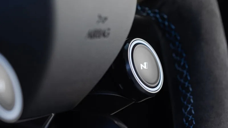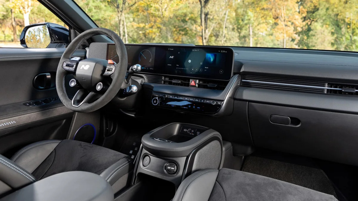 Inside, the N doesn’t greatly differ from other Ioniq 5s, but there are a few meaningful changes, including a rear window wiper, which is a bigger win than you might think. The 5’s nifty sliding center console is gone, replaced by a lighter, fixed setup with a wireless charging pad. Heavily bolstered sport seats provide enough comfort for long stints behind the wheel, and there are little Alcantara touches here and there – including the steering wheel.