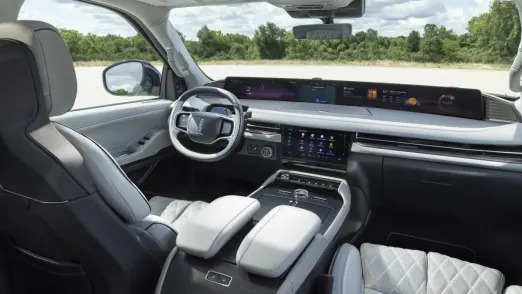 Things really start to look totally new when you hop into the front seats and take in the new 48-inch panoramic display that spans the whole width of the dash. You’ll recognize the Lincoln Digital Experience setup from the 2024 Nautilus where it debuted, and it operates in a similar manner here. Both the 11.1-inch touchscreen infotainment and steering wheel thumb controls (along with voice commands) can be used to control what goes on in the giant screen ahead of you. A new squircle-style steering wheel aims to not cut off the view of the big screen. Lincoln added video streaming and in-vehicle games available to play on the giant pano-display for the Navigator, but only when the car is in park. The infotainment is powered by Android Automotive, too, so that means you get Google Maps for navigation and the Google Assistant for voice commands. And yes, both Apple CarPlay and Android Auto are still on the menu.