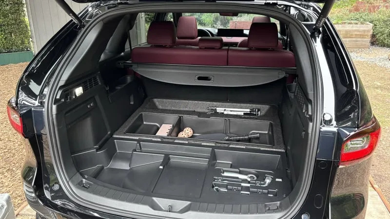 Now, because the CX-70 is a three-row SUV with the third row deleted, it has a massive cargo area for a two-row model. It may fall just short of the boxier Honda Passport (itself just a two-row, last-generation Honda Pilot), but it betters the Grand Cherokee and blows away the Lexus RX. There’s also some underfloor storage space in place of a third row, but it’s difficult to access and, honestly, we think it’s more likely that someone would use the CX-90’s third-row seat.