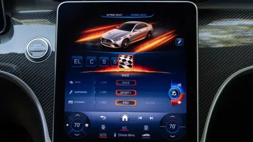 Visually, the 3-inch-wider fenders wrapping those uniquely larger wheels are the easiest telltale this isn’t a C 43. There’s also a unique front fascia that elongates the car by 2 inches, an aerodynamic hood vent, special red badges that’ll be the tell for all future E Performance models, and the first application of the Affalterbach badge to an AMG’s exterior (it replaces the usual Mercedes hood crest). The interior gets unique AMG and hybrid displays, an AMG Performance steering wheel that’s a delight to hold, and the option for AMG Performance seats. We found the standard “Sport” seats to be plenty grippy and abundantly adjustable.