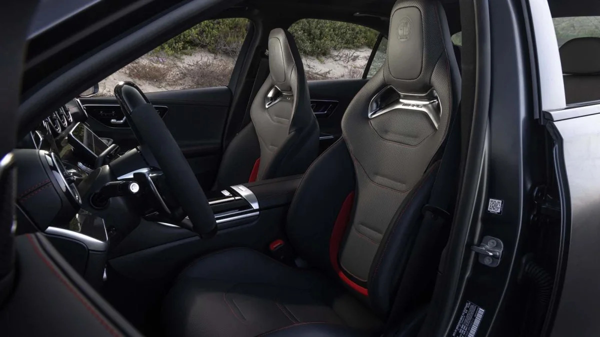 Visually, the 3-inch-wider fenders wrapping those uniquely larger wheels are the easiest telltale this isn’t a C 43. There’s also a unique front fascia that elongates the car by 2 inches, an aerodynamic hood vent, special red badges that’ll be the tell for all future E Performance models, and the first application of the Affalterbach badge to an AMG’s exterior (it replaces the usual Mercedes hood crest). The interior gets unique AMG and hybrid displays, an AMG Performance steering wheel that’s a delight to hold, and the option for AMG Performance seats. We found the standard “Sport” seats to be plenty grippy and abundantly adjustable.