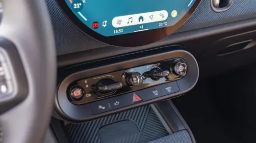 Under the big round screen sits a toggle bar that houses the gear selector, a start/stop key that you twist to start the car, the Experience Mode toggle and the volume control. The gear selector offers Reverse, Neutral and Drive/Brake (a separate parking brake button sits to the left), with the D/B mode offering multiple levels of off-throttle braking. As fans of one-pedal EV driving, we put the Countryman SE in its strongest regenerative mode, which also improves efficiency. We didn’t feel any odd sensations while transitioning from regenerative to friction braking.