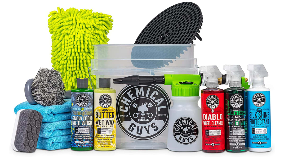 This bundle is the biggest one on our list, but it’ll put you in the best position to have the cleanest looking ride you could ever have. It comes with 14 pieces: Butter Wet Wax, Honeydew Snow Foam, Diablo Wheel Gel, Silk Shine Dressing, Signature Glass Cleaner, Detailing Bucket, Cyclone Dirt Trap, Torq Foam Blaster Gun, Microfiber Wash Mitt, Short Handle Brush, 3 Microfiber Towels and a dressing applicator. It should have you covered for both your interior and exterior, so if you’re looking for a one-stop shop, this kit is the one you should consider.