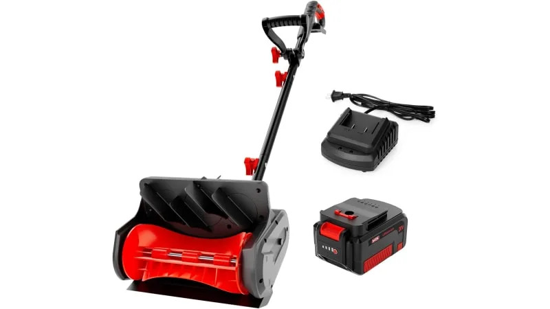 The MZK cordless snow shovel is great option if you don’t need a large snow blower but want more than a manual shovel. This MZK weighs just 9.15 pounds and the 20V batter will work with your other MZK battery-powered tools. It comes with a fast-charge capable 4Ah battery that will get you about 40 minutes of usage on a a full charge. This snow shovel has a 13-inch snow clearance width and an adjustable snow chute let’s you control where you throw the snow. Overall the MZK cordless snow blower is a great portable option for lightweight winter maintenance needs.