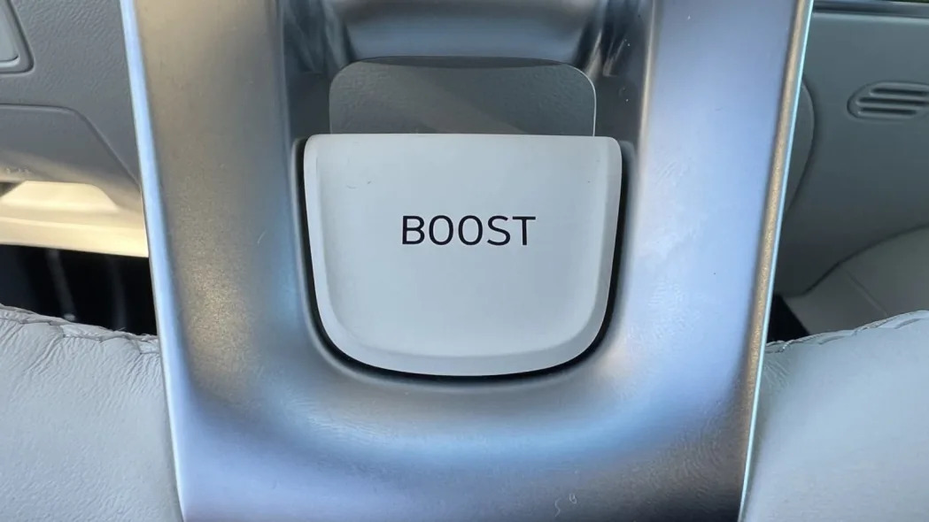 If Sport mode isn’t fast enough, or you just need a short burst of power when merging onto a highway, there’s a “Boost” button on the bottom of the steering wheel. It temporarily increases output by 54 horsepower, allowing for just a tad of entertaining wheel spin when blasting away from a stop light. It lasts for 10 seconds, then is ready to go again (unless the battery is below 25%). It also creates a fun animation on the driver’s display, like a subtle star-streaking like the Millenium Falcon going into hyperspace.