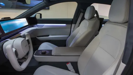 We recently got the chance to take our closest look yet at an Afeela prototype, one in such early stages that we weren’t allowed to open the hood, trunk, or even the center console under-armrest storage compartment. We couldn’t drive it either, but were able to better understand the direction Afeela plans to take on-board technology and entertainment.