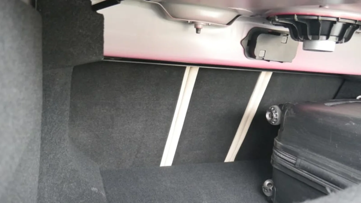 There’s just not a lot of height in this trunk, and there are things hanging down that hamper it further. Shown above are speakers can might catch on something, plus the fat structural crossmember running above the fold-down seat pass-through that prevents bags from sliding all the way back.