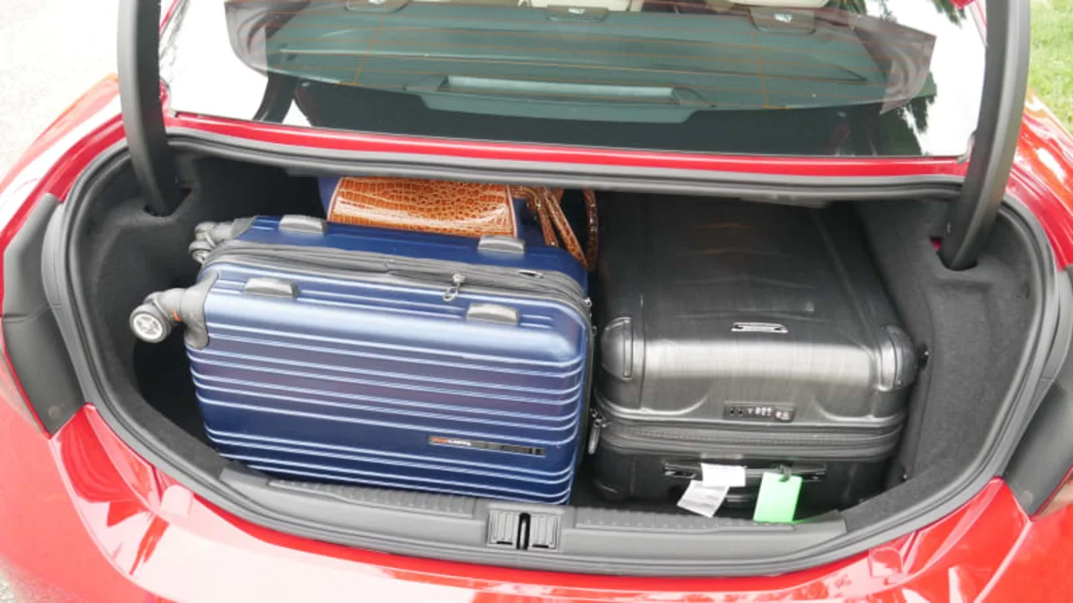 So how does this compare to its sport sedan competitors? It’s in fact just a little better than the G70, which could only fit the three biggest bags but had a bunch of leftover space for smaller, soft-side bags or totes or something. The CT4 was better, fitting everything but the biggest bag with less space left over than either the Alfa or G70. The standard BMW 3 Series could fit everything but the fancy bag, while the plug-in hybrid 330e matched the CT4.