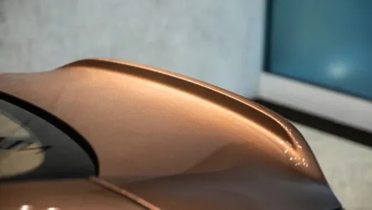The Vanquish shown in New York flashed a spectacular paint called Magneto Bronze, an on-trend mix of plum and bronze, inflected with precisely sprayed mica particles. That was paired with a mocha-flavored “Centenary Tan” interior, including patterned leather seats.