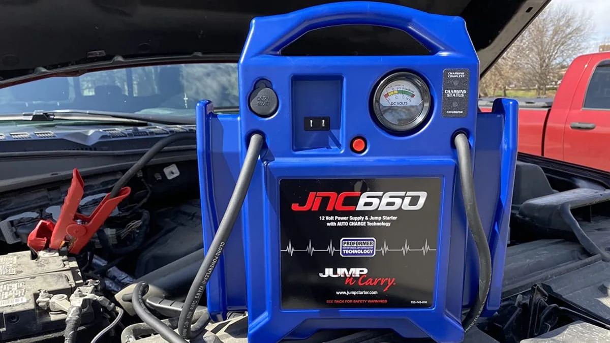 The Clore Automotive Jump-N-Carry starts all passenger vehicles and light commercial vehicles. It holds up to 40 jumps per charge and features 1,700 peak amps and 425 cranking amps of power with a 22Ah Clore PROFORMER Battery. The AWG cables attached are 46-inches long and the jump starter even features a built-in DC outlet to power 12 volt accessories.