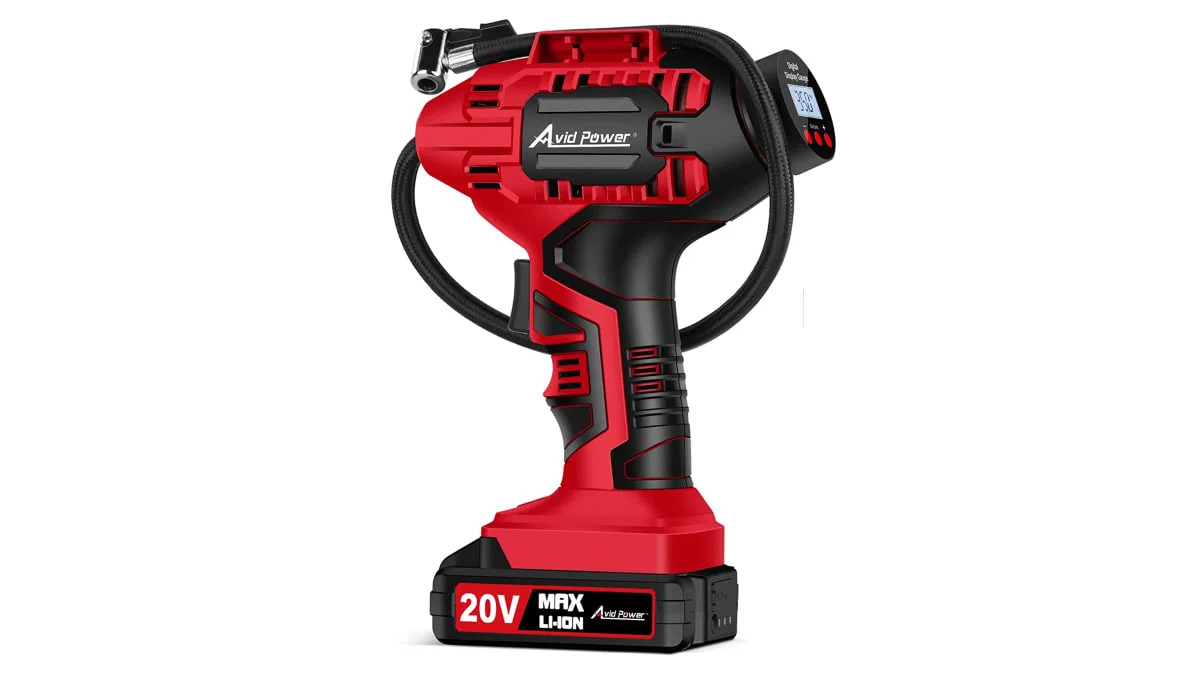This AVID POWER Tire Inflator Air Compressor has an internal 20V lithium-ion battery power source and offers a maximum pressure of 100 PSI. It can be used as a cordless compressor, or powered with its 12V DC adapter if the battery is low. There is a screen that offers real-time monitoring of your PSI while inflating. There is also a LED light that is very helpful when using this compressor in the dark.