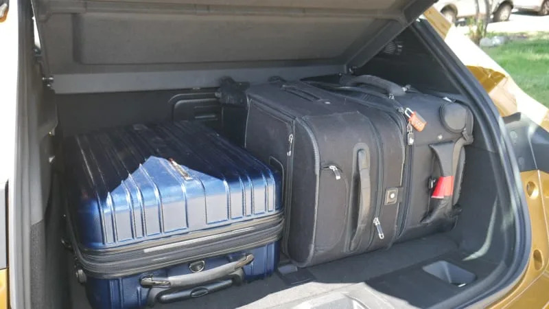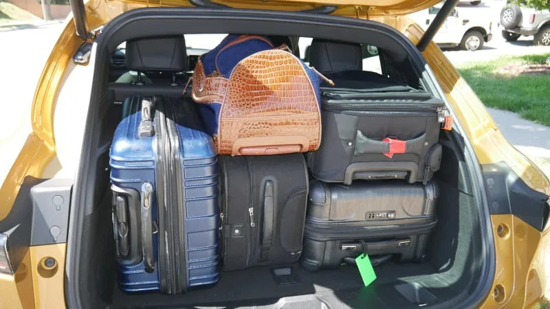 Upper left (or just upper for those on mobile), is literally the best I could do. The fancy bag isn’t squished and shouldn’t fly forward into the cabin (two criteria for an acceptable luggage test Tetris), but it does block rear visibility since it goes all the way to the roof. As such, that isn’t the official result.