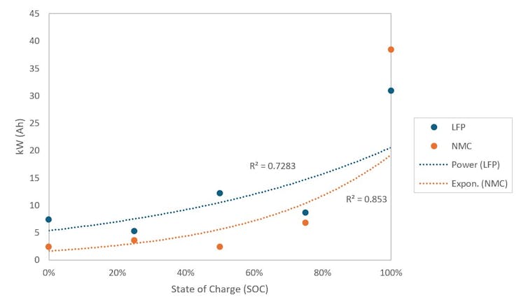 Beyond just battery type and capacity, the study also explored whether the level of charge in a battery – known as state of charge (SoC) – influences the power released during a fire. The data was divided into five segments – charge levels of 0%, 25%, 50%, 75%, and 100% – and a new metric, kW per Ah, was introduced to account for the Heat Release Rate (HRR) as a function of battery capacity.