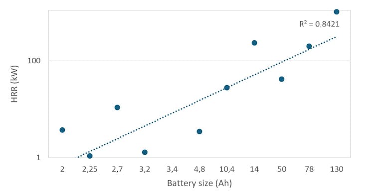 Our analysis did, however, reveal notable differences in fire behaviour between NMC and LFP batteries as capacity increases. At lower capacities, NMC batteries show relatively low maximum HRR, but this spikes dramatically at higher capacities, exceeding 100 kW, as the graph below demonstrates.