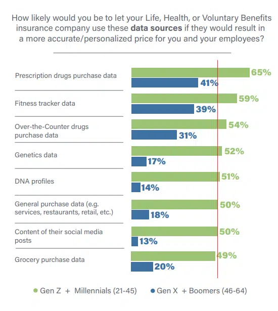 Gen X and Millennial SMBs are overwhelmingly interested in the use of new data sources for more accurate, personalized pricing as seen in Figure 4 — which given the interest in individual and portable products is key. Between 49% and 65% of Gen Z and Millennial SMBs are interested in their use for life, health, and voluntary benefits. In contrast, Gen X and Boomers are less comfortable overall, with prescription (41%) or over-the-counter (31%) drug purchase data and fitness tracker data (39%) representing the most interest. Interest in all other data sources drops dramatically, with a low of 13% for content from social media posts and 14% for DNA profiles.
