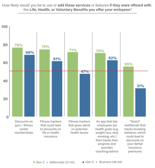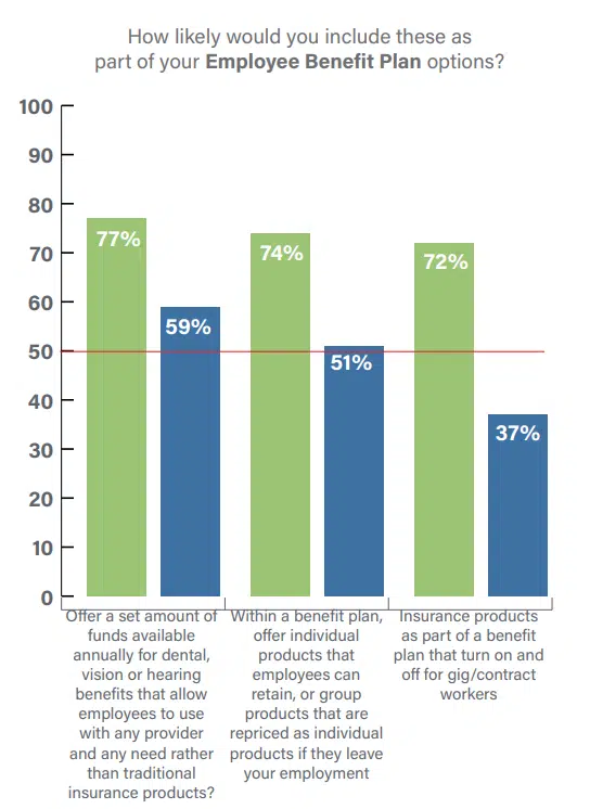 Likewise, benefit products that are offered as individual/worksite products, or as group products that can be repriced and ported for employees to take with them if they leave employment are of high interest from Gen Z and Millennial SMBs (74%). They recognize their generation’s tendency to see employment as fluid. Their response is to seek benefits that will attract talent by fitting with a prospect’s vision of their future — instead of assuming that they will stay with the company long-term. And while interest is lower with Gen X and Boomer SMBs (51%), there is still strong market potential. Increasingly, employers and brokers are seeking benefit plans that offer a broader range of products that meet the changing needs of their diverse employee base – highlighting an opportunity for insurers to think beyond traditional benefit offerings.