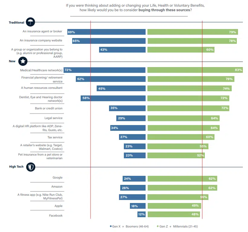 After these five channels, Gen X and Boomer SMBs show significantly less interest in any of the other options. In contrast, Gen Z and Millennials are interested in all of the channel options, even two of the GAFA companies (Apple and Facebook) which are just under 50%. Some analysts are predicting Apple will enter the health insurance market in 2024, leveraging rich fitness and health data gathered from millions of Apple Watch users,[i] which will directly align with their desire for personalized insurance using data from fitness trackers.