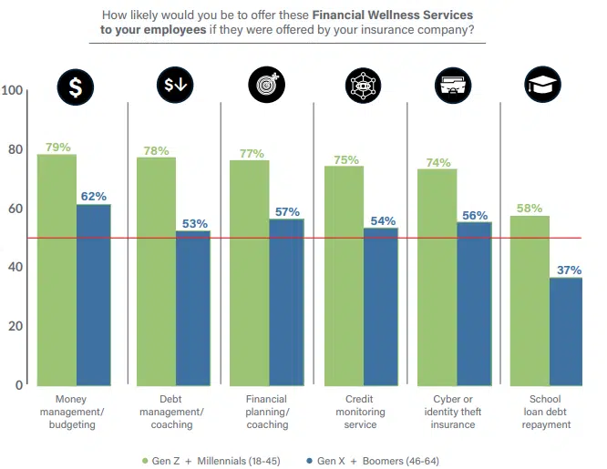 Personal experiences and views of retirement financial viability are likely influencing these gaps. Gen X and Boomers have accumulated more financial management abilities and confidence over time and have reached or are approaching Social Security eligibility. In contrast, the younger generation struggles to buy homes and has concerns about whether Social Security will be available when they retire. Insurers who can help employers address these issues have an opportunity to build trust and loyalty.