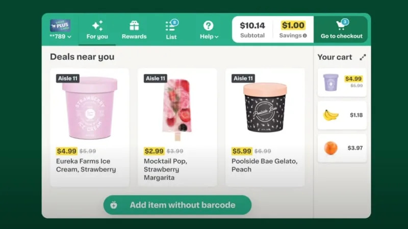 Equipped with cameras and sensors, the cart has a screen that will share real-time recommendations based on what customers put in the cart, like advertising ice cream if a customer buys cones.