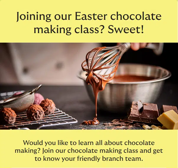 And if you’ve got the crafting bug, come along to one of one our branch events. This Easter, we’re holding family craft days, wreath-making workshops and chocolate-making classes. Give your local branch a ring or stop by to ask the team what they’ve got planned over the next few weeks.