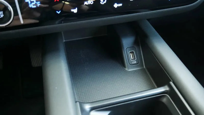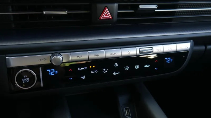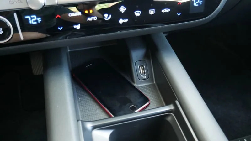 On the upside, the USB data port needed for Apple CarPlay and Android Auto (wireless not available) is right here. It’s annoyingly down by the floor in the Ioniq 5 and Kia EV6 (the Ioniq 6’s mechanically related cousins that share the same E-GMP platform).