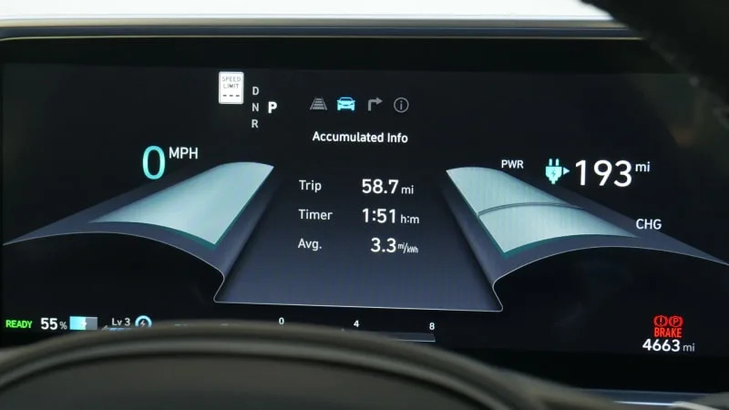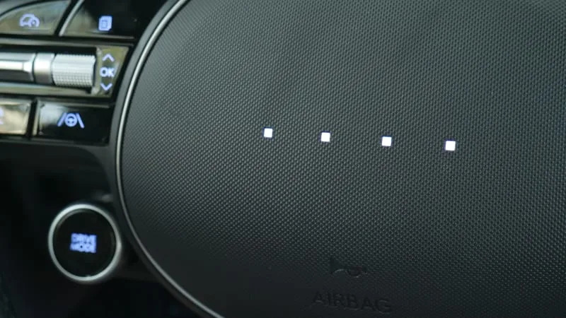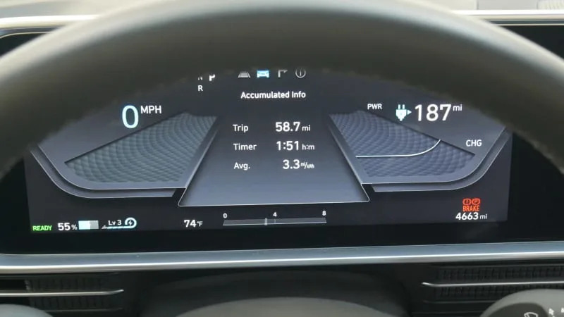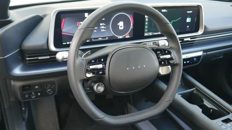 Here is the shifter, which is the same as the Ioniq 5’s. It makes sense in theory: Twist forward for Drive, twist backward for reverse. Except, if you’re used to “monostable” shifters on the center console where you push forward for reverse and pull back for drive, this control setup will seem backwards.
