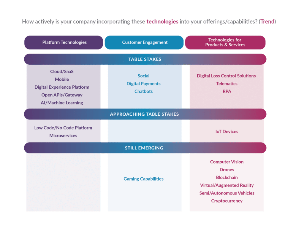 After tracking three categories of technologies, the pace of experimentation and adoption of each specific technology is aligning to either table stakes, approaching table stakes, or still emerging, as highlighted in Table 1 below. Yet, despite the evidence of new technology solutions becoming table stakes, many insurers remain behind the curve when it comes to leveraging the benefits of new technology due to significant legacy systems and a lack of progress in new business models to better leverage these technologies.