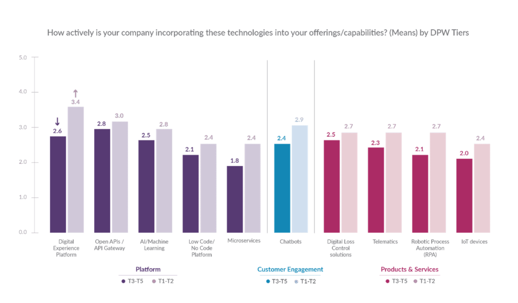 When it comes to the specific technologies that power the insurance platform, mobile, Cloud/SaaS, Digital Experience Platforms, APIs, and AI/Machine Learning are now in the table stakes phase. Microservices and Low Code/No Code Platforms have advanced from the early adoption stage and are rapidly approaching table stakes. Three Customer Engagement technologies are also table stakes – Digital Payments, Social and Chatbots.