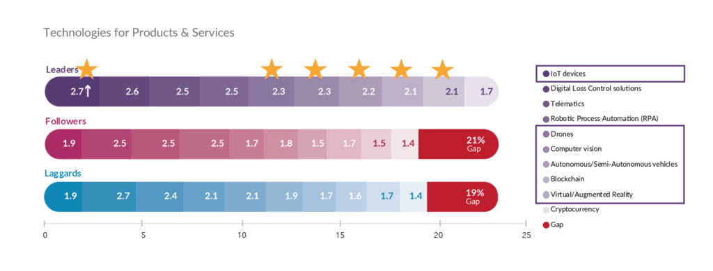 Interestingly, for several other technologies, Followers are surprisingly behind both Leaders and Laggards (though by only a few points), including digital loss control, drones, semi/autonomous vehicles, virtual/augmented reality, and computer vision. Regardless, both Followers and Leaders once again are well behind Leaders from 30%-48%, highlighting significant gaps in adapting to a broader set of technologies embraced by customers.