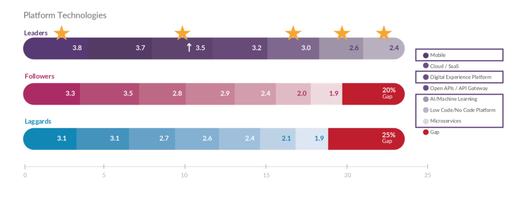 Unfortunately, Laggards are consistently behind Leaders, averaging a 25% gap across all seven platform technologies, but with a large gap of 32% for digital experience platforms. Followers have more variation with 8%-16% gaps in three platform technologies including mobile, Cloud/SaaS, and open APIs, which are foundational. However, they have significant gaps of 25%-30% to Leaders in microservices (30%), digital experience platform (29%), Low Code/No Code platform (27%), and AI/ML (25%) – all of which are crucial in creating new customer experiences, leveraging data, and creating greater flexibility for the business.