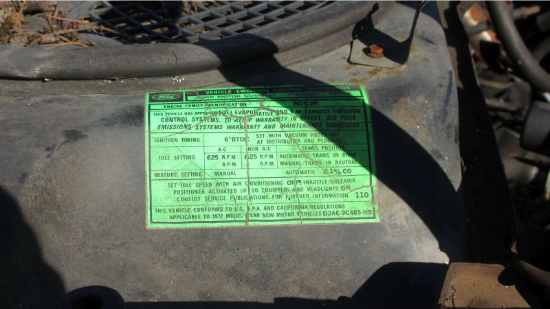 The engine was gone when I got there, but this sticker tells us it was a 351-cubic-inch (5.8-liter) Cleveland V8 with two-barrel carburetor, rated at 163 net (not gross) horsepower. Junkyard shoppers still grab 351C engines soon after they hit a yard’s inventory.