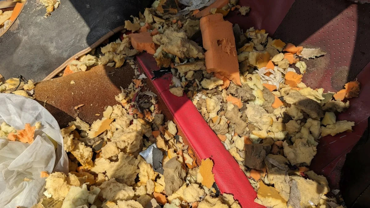 All the chawed-up seat foam suggests that raccoons and other Golden State wildlife lived inside for quite a while.