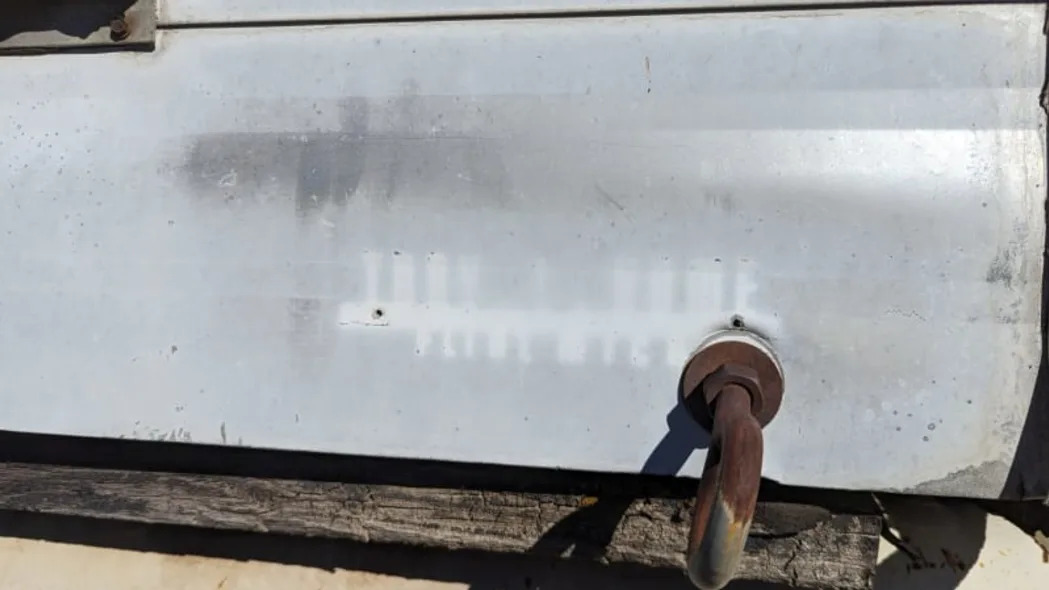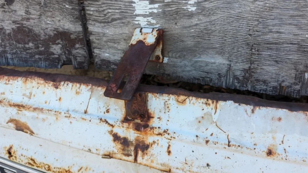 The shell’s rear window has been replaced with plywood and secured with a hasp-and-padlock rig.