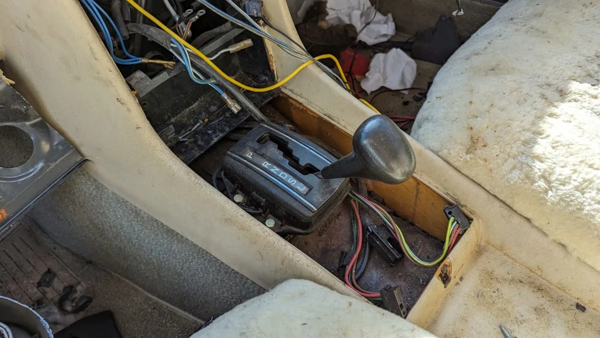 This one was too far gone to have much chance of ever being put back into service. At some point, the decklid or at least the decklid badge from a late-1980s car was installed.