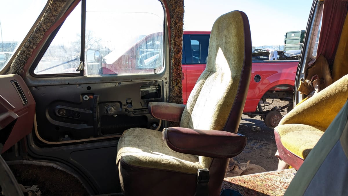 Once the 1970s really took effect, custom vans became all the rage. Bubble windows, deep shag carpeting speckled with wacky-tabacky seeds, wood-burning stoves, 8-track players, lava lamps, black-light art on velvet, and wild exterior murals all became de rigeur in the vanning world. It wasn’t long before a slightly less red-eyed and more family-oriented variation on the custom van theme hit the mainstream: the conversion van. Shops would start with the cargo version of a factory-fresh Detroit van and outfit it with big windows and accessories to make long road trips and camping stops more comfortable. Naturally, the early conversion vans still had something of a disreputable air about them, and that whiff of degeneracy still hovers about this 1978 3/4-ton Chevy Van that I spotted in a Denver-area self-service car graveyard recently.