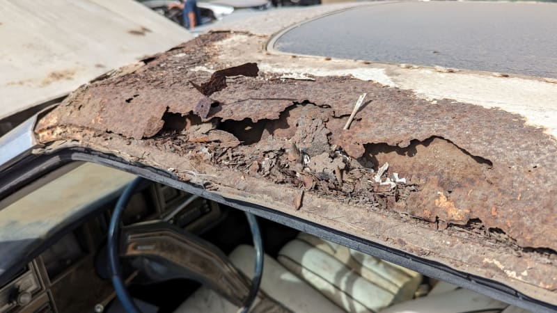 A white padded-vinyl “carriage roof” was standard equipment on the Bill Blass Mark V. It was a $1,200 option (about $5,286 in 2023 dollars) on ordinary Mark Vs. The one on this car trapped water against the sheet metal and caused it to rust out.