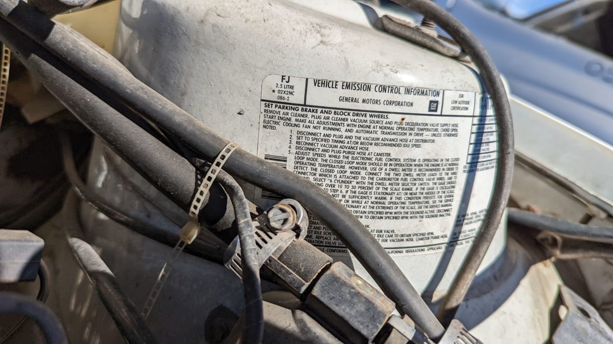Yes, that’s a 2.5-liter Iron Duke four-banger under the hood. Essentially one cylinder bank of the Pontiac 301 V8, the Iron Duke ran rough but held together fairly well by the standards of its time. This one was rated at 90 horsepower and 134 pound-feet.