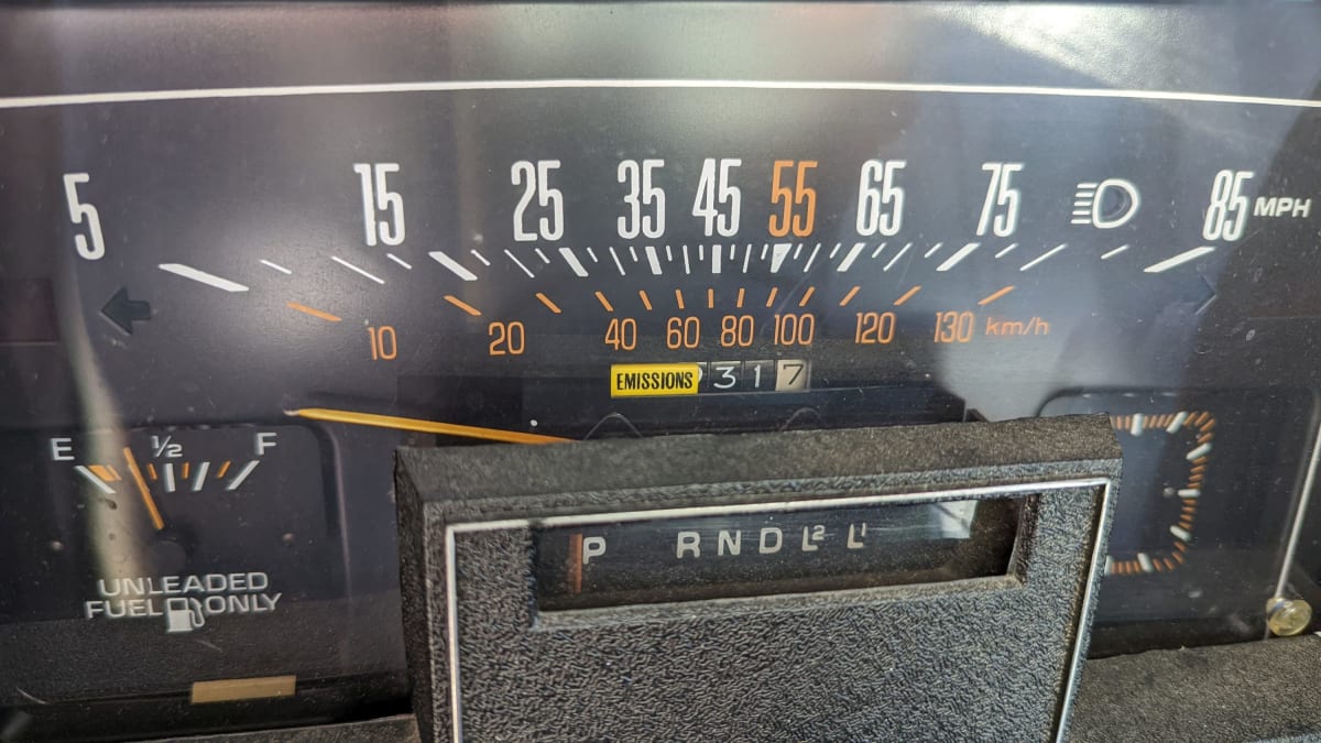 According to the owner’s manual, the yellow EMISSIONS indicator appeared over the odometer (on “some cars”) when either the oxygen sensor or the catalytic converter was due for replacement. I wonder how many years this one has been visible.