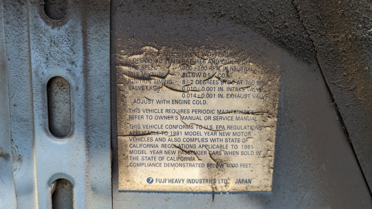 This car, like so many I find in Colorado junkyards, began its career in California. The California-spec ’81 Leone cost $99 more than its 49-state counterparts, due to additional emissions hardware and testing ($342 now).